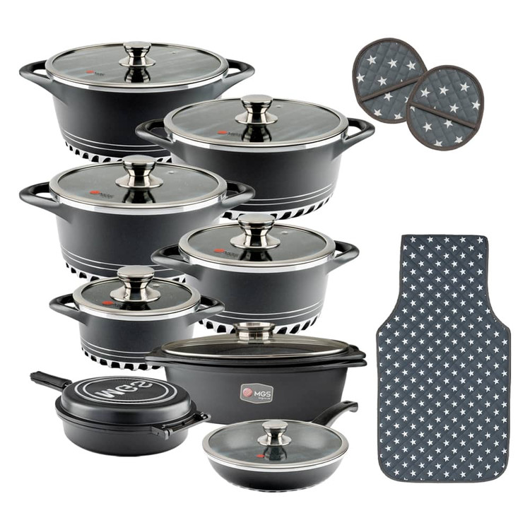 سرویس قابلمه ۲۲ پارچه MGS مدل Italy C مشکی یک انتخاب لوکس و کامل برای کسانی است که به دنبال دوام، زیبایی و کارایی بالا هستند. این سرویس بهویژه برای جهیزیه و خانوادههای پرجمعیت توصیه میشود.
