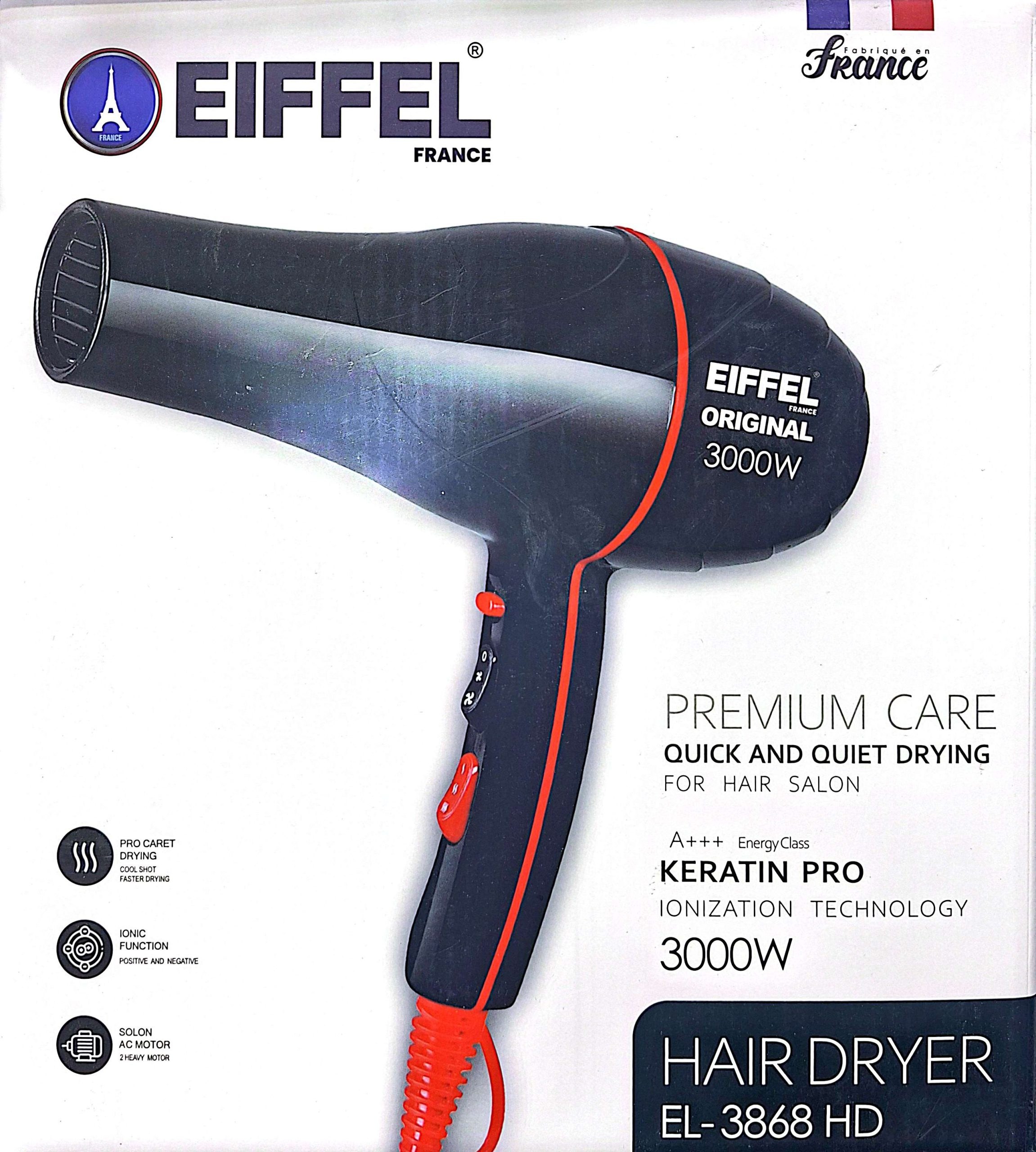سشوار سالنی ایفل مدل EL‑3868HD یکی از محصولات پرقدرت و بادوام برند ایفل محسوب میشود. توان 5000 وات و موتور AC به آن قدرتی میدهد که برای استفاده پیوسته در سالنها کاملاً مناسب است. طراحی ارگونومیک، صدای پایین نسبی و عملکرد مؤثر باد سرد از ویژگیهای برجستهاش هستند.